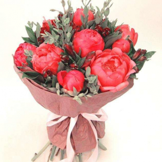 Букет состоит из розовых пионов и белых роз, украшенных свежими листьями. Розовые пионы добавляют нежности и изящества, а белые розы придают букету чистоту и неповторимость.